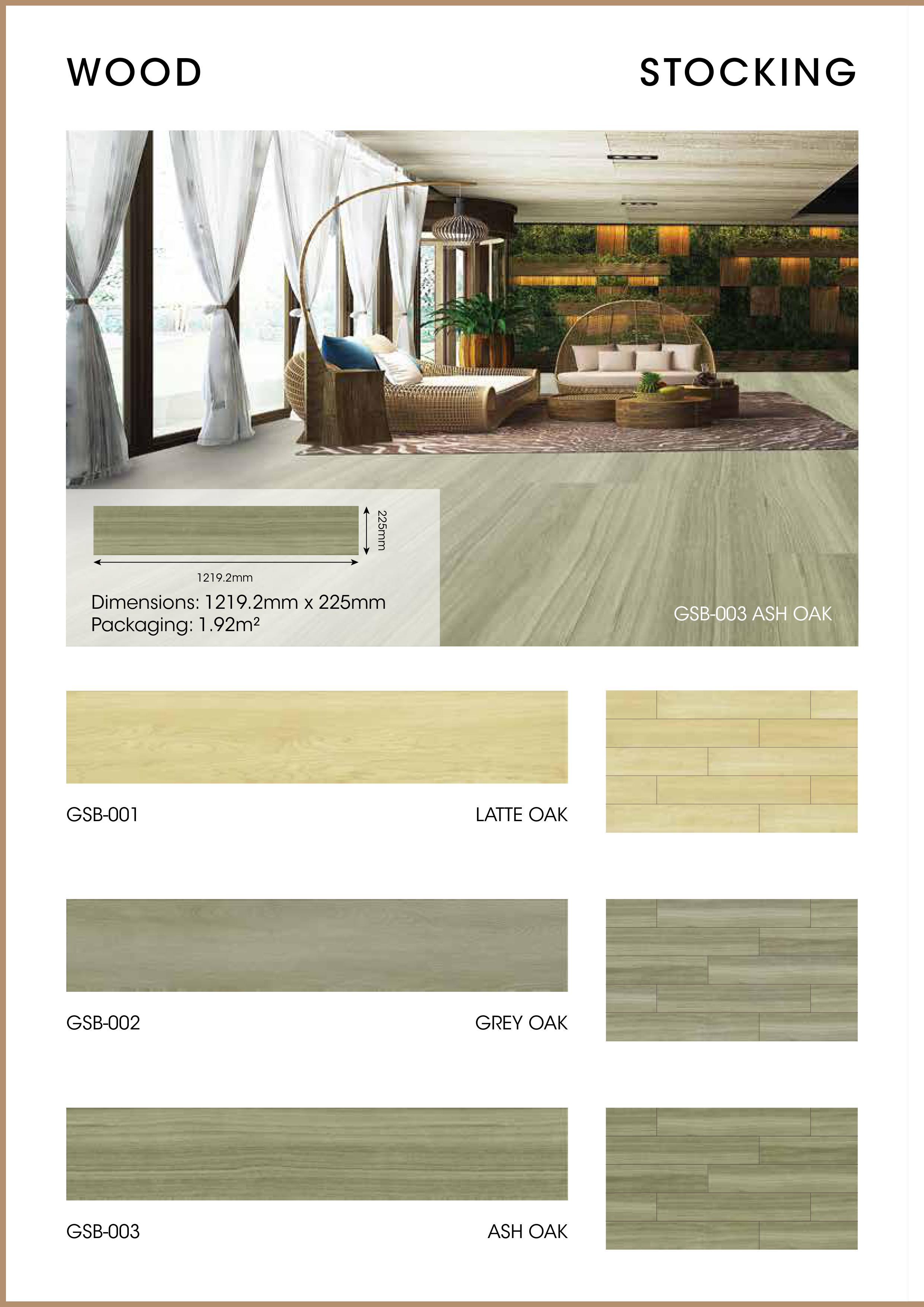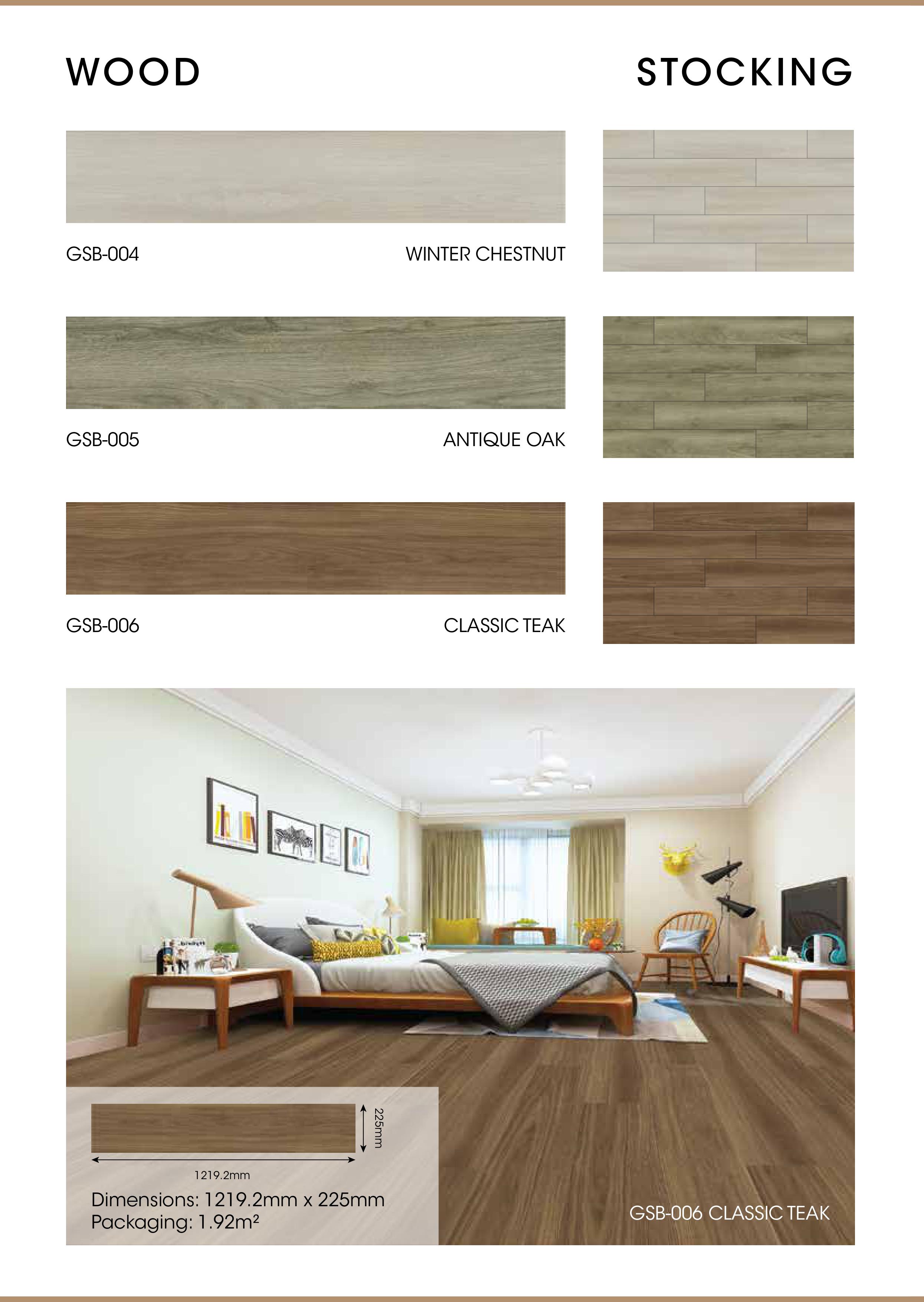 Wood: (225 x 1219.2 x 6.5 /0.5 (mm)): GSB-001 Latte Oak; GSB-002 Grey Oak; GSB-003 Ash Oak; GSB-004 Winter Chestnut; GSB-005 Antique Oak; GSB-006 Classic Teak;